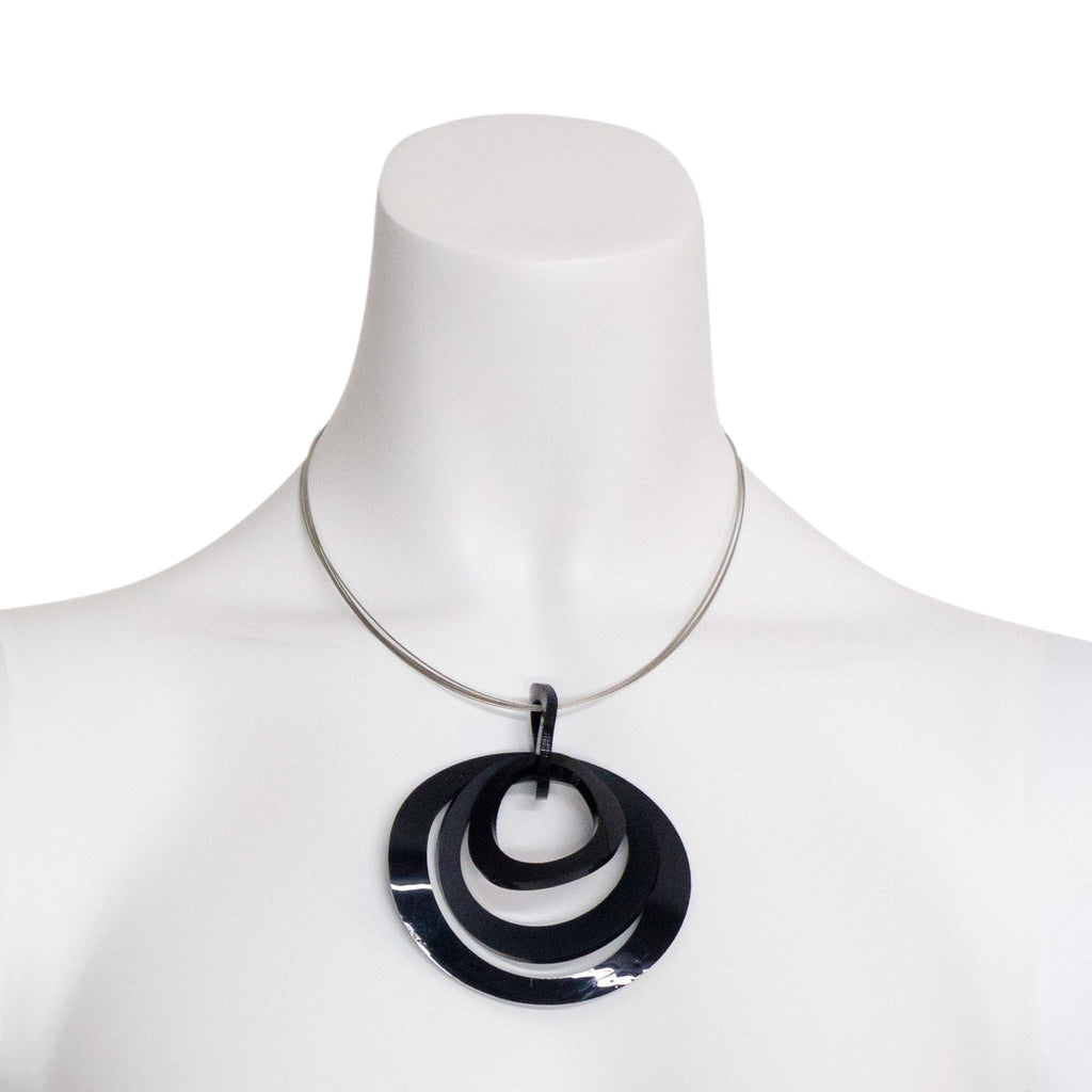 These 3 wavy acrylic rings and silver chain are joined together by a small acrylic circle piece. Rests nicely below collar bone.