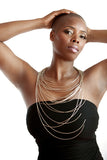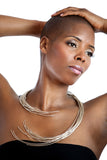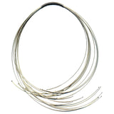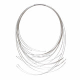 13 lines of Italian sterling silver cable held together with a curved silver tube- the ultimate in simplicity, yet a dramatic statement on your neck. The cables are free-floating and can be pulled on either side to lengthen the strands and make each piece truly unique. Click through the pictures to see the dramatic difference in look! Great any day, anytime, anywhere necklace!