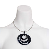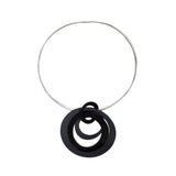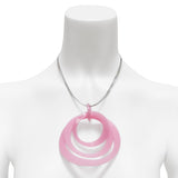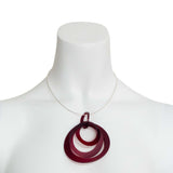These 3 wavy acrylic rings and silver chain are joined together by a small acrylic circle piece. Rests nicely below collar bone.